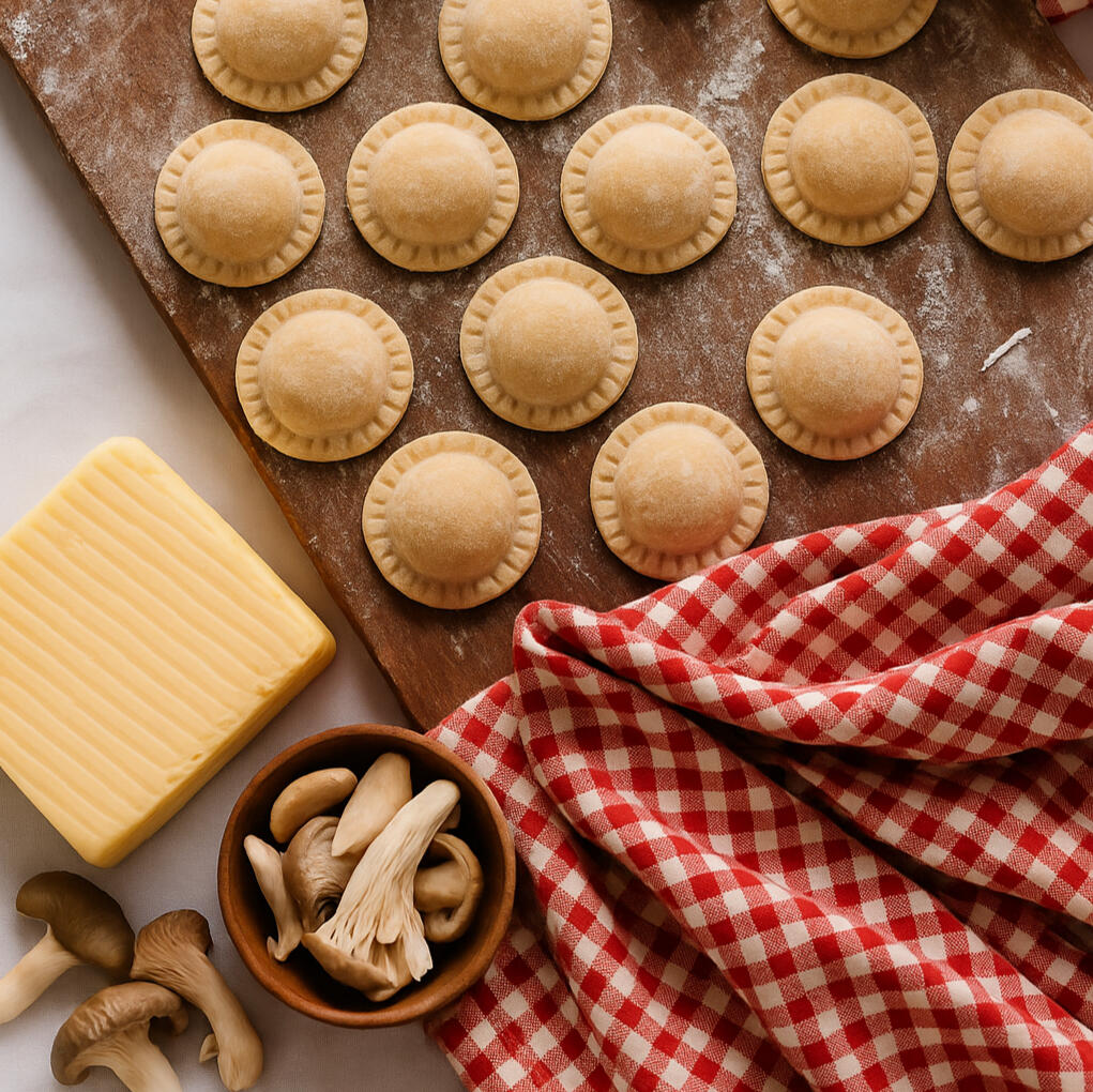 Una mezcla profunda y aromática de hongos París, Shiitake y Ostra, salteados con mantequilla, ajo y hierbas, envueltos en una pasta artesanal suave y generosa.